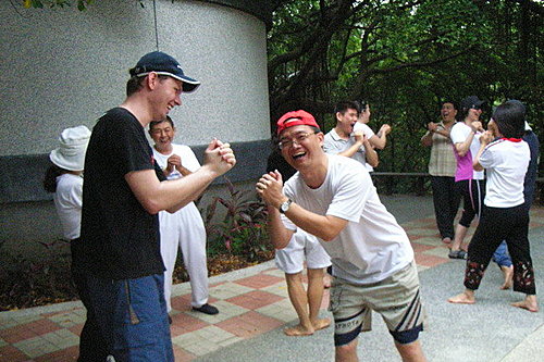 目前全台灣像敢於像我的特殊方式---把大笑當運動---每天「製造」快樂的人數可能不超過30人, 但是很高興的是,人數逐漸增加中。人類雖然自詡為「萬物之靈」,好像對自己的腦袋非常自豪,其實我們很多人並非自己腦袋的主人,而是腦袋的奴隸。嘴巴說要 「健康」,也知道「快樂的人比較健康」,但是心情卻無法快樂起來。如果說瘋子是「妄想達到某一個目標,但是卻每天固定原來的行為模式」,則最嚴重程度的人 住在精神病院,輕度者就是看來很正常的你我他了。如果我們決心做腦袋的主人,如果我們勇於做身體的主人,為何一定要等到遇到「好笑的事件」,因而產生快樂 的情緒,然後才可以笑出來?是誰規定這樣的?我們這一群台灣的「先驅」笑友,雖然天資不夠靈巧,學歷也不是很高,但是我們決心做自己的主人,要打破「快樂 才能大笑」的世俗看法,我們嘗試「大笑之後也可以快樂」的實驗。台灣自2004年引進愛笑俱樂部以來,經過5年 的「人體實驗」,我們證實「假笑真的可以變成真笑」。我們每天早上來到公園,從暖身到暖心,從「瑜珈式的笑」做到「搞笑的笑」,從外在的笑運動,到內在的 心靈按摩。外人看我們像「肖仔」,我們卻相信:「人活著,可以笑著開始每一天」。有意嘗試者歡迎上網查詢「關鍵字」【百善笑為先】。